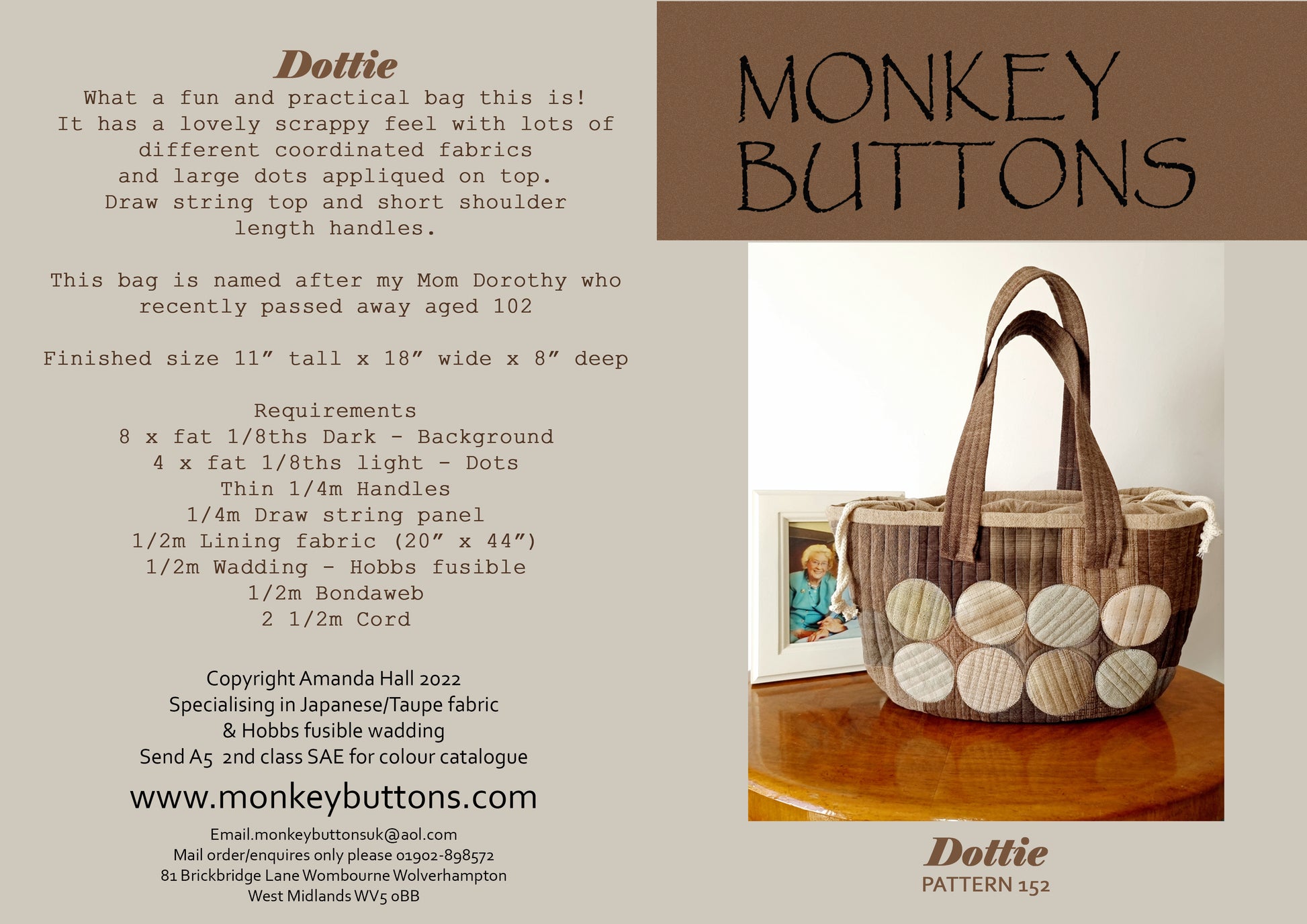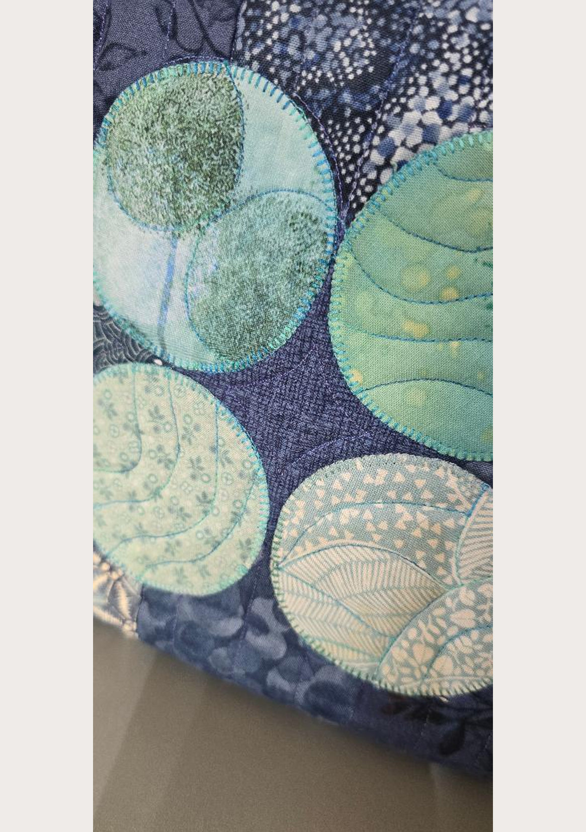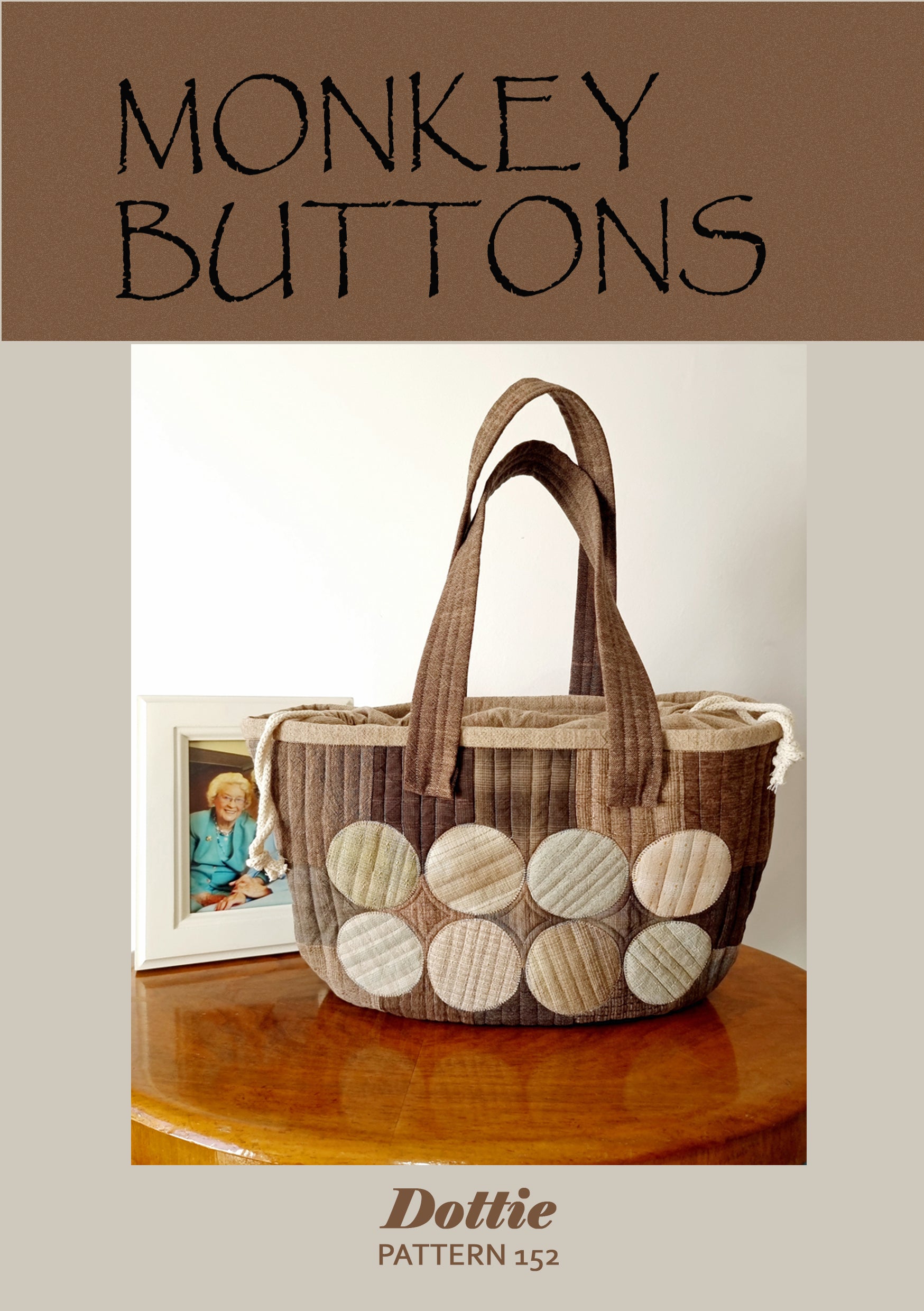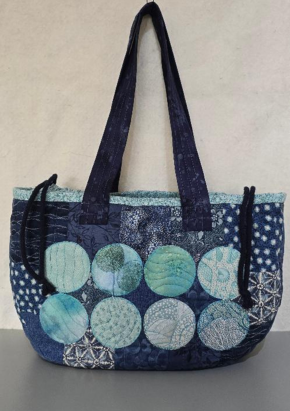 What a fun and practical bag this is! It has a lovely scrappy feel with lots of different coordinated fabrics and large dots appliqued on top. Draw string top and short shoulder length handles. Great for a beach or craft bag