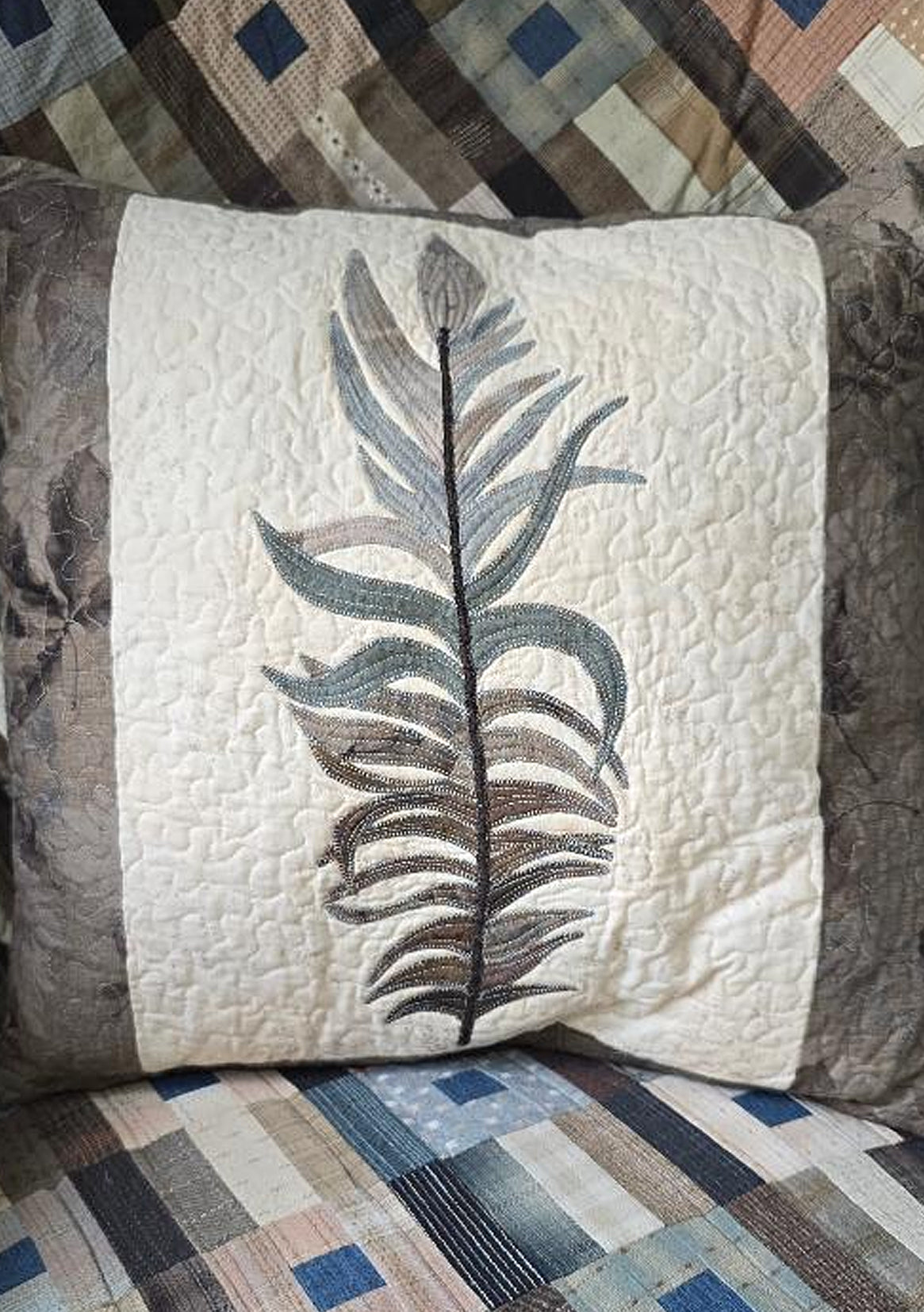I have made four different feather panels using a selection of taupe fabrics and created them with bonded appliqué.