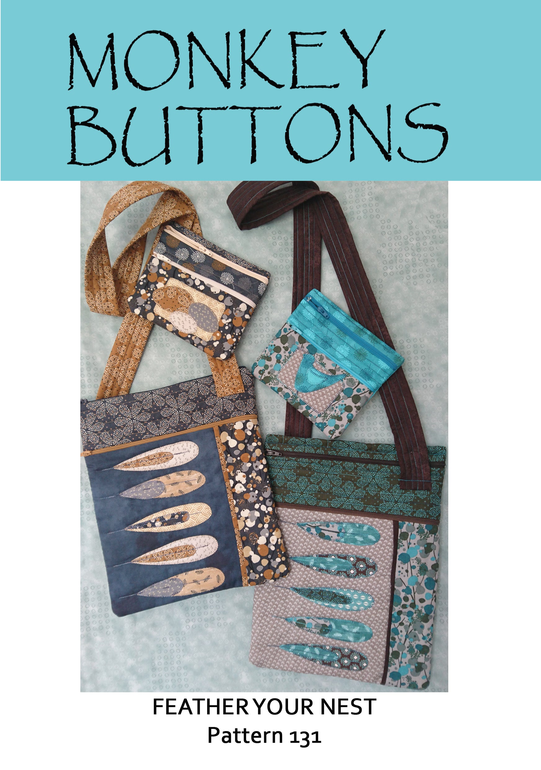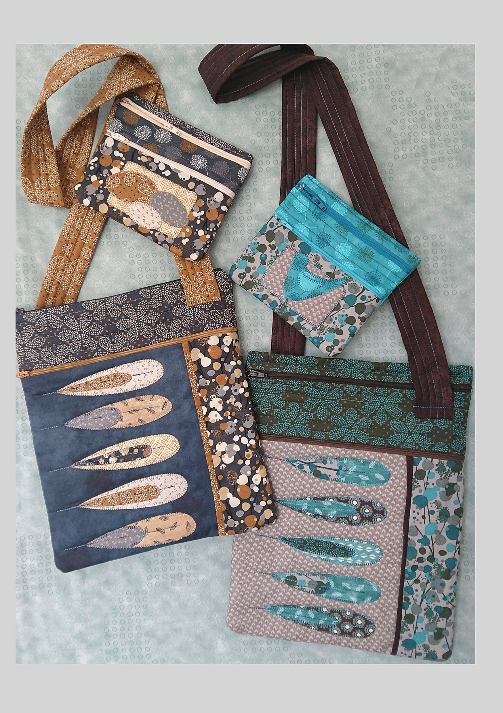 The bags feature an appliqued feather panel with contrasting side bands. This panel forms a zipped pocket. The bag also has a zipped top closure.